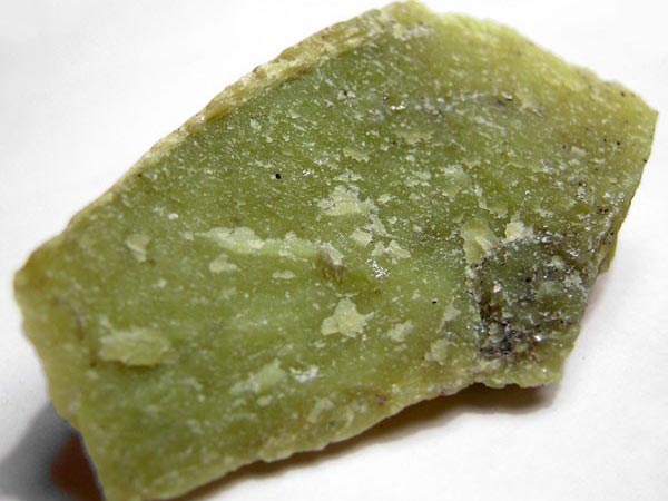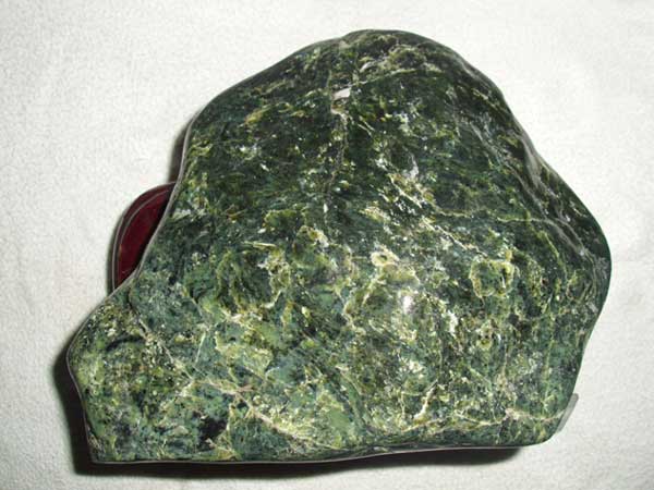 蛇紋石質玉石質地呈細膩的致密塊體,質地細膩,用手觸摸有滑感。它由細小纖維狀、葉片狀和膠狀蛇紋石晶體組成,呈網斑狀結構。有時在均勻分布的基底上,可見密集堆積的云朵狀白色斑狀。少數纖維狀塊體琢磨后有貓眼效應。