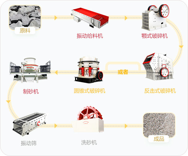 設(shè)備配置:顎式破碎機、反擊式破碎機或液壓圓錐破,制砂機,洗砂機,圓振動篩等設(shè)備